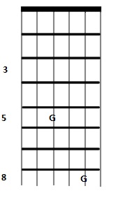 The same octave shape applies to the fifth and third strings. Knowing that the note on the fifth string, 3rd fret is a C, you can see that the note on the third string, 5th fret is also a C, one octave higher (see diagram).