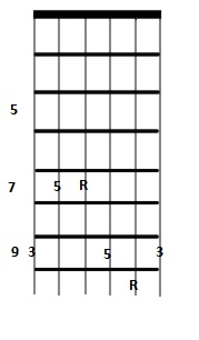 The shapes in diagrams 2 and 3 share the root and fifth of the chord (here at the 7th fret). This shape is rarely played as a chord since it would be very difficult to finger but is still important to know as it provides a link between the chord shape in diagram 2 and the the chord shape in diagram 4 below whose root note occurs on the fifth string. The fourth string root shape also become more useful when it is modified to a seventh chord (more of this next post).