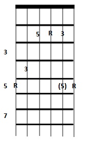 The chord shape in diagram 3 below shows an A major chord whose root occurs on the fourth string (here at the 7th fret).