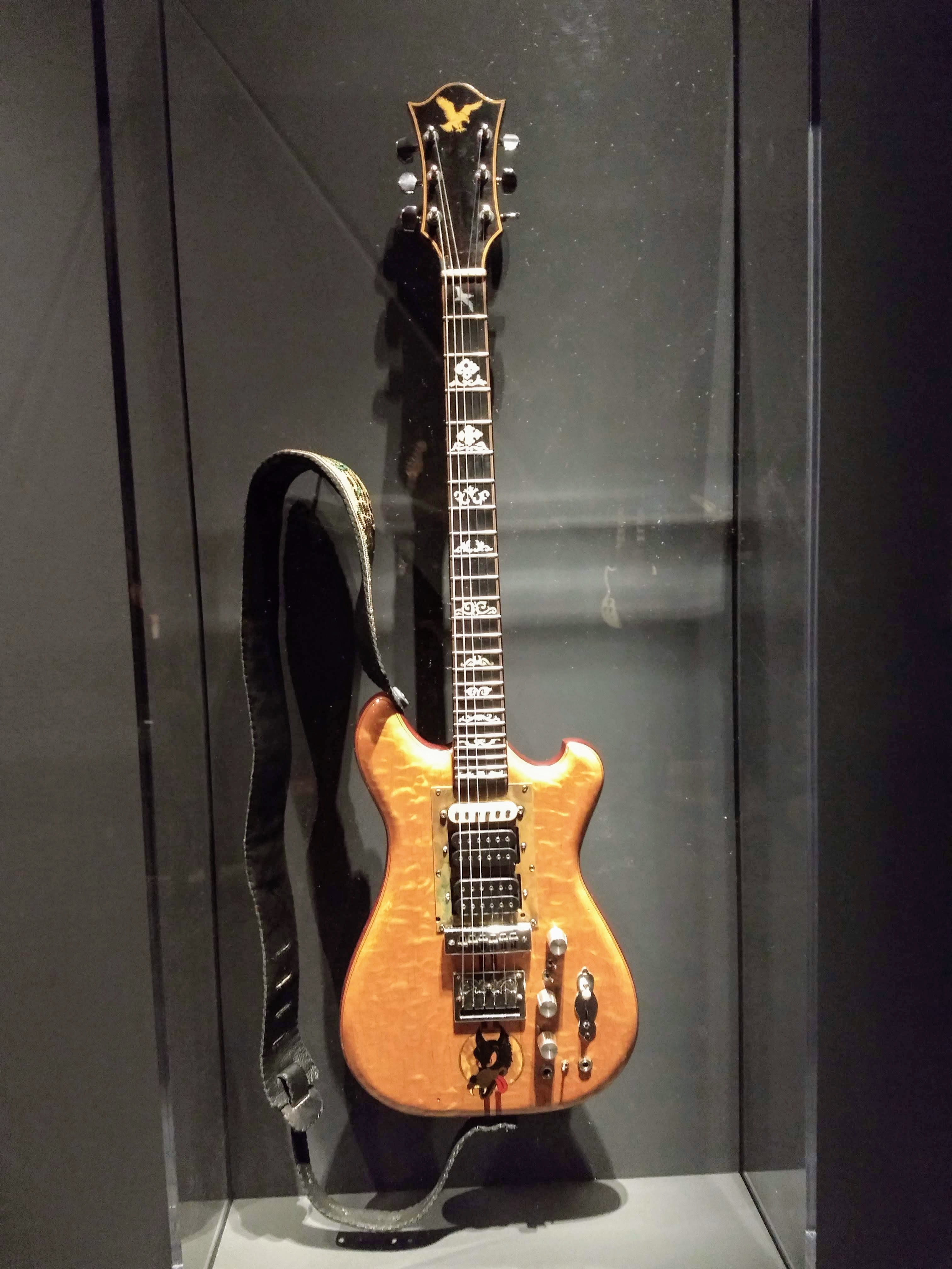 Immediately after receiving Wolf, Jerry asked Doug Irwin to make another guitar, telling him, “don’t hold back.” Six years later, Irwin delivered the guitar known as Tiger and it became his most played guitar. Jerry talked glowingly about the variety of sounds it gave him to play with and it was his primarily guitar through the eighties, eventually being replaced by another Doug Irwin made guitar known as Rosebud (which is not part of the exhibition). After Garcia’s death, Irwin won the guitar back in a legal settlement, and auctioned it off for $850,000 in 2002. It was purchased by Jim Irsay, owner of the Indianapolis Colts and guitar collector. Irsay has been generous with lending out the instrument and on what would have been Garcia’s 74th birthday, the guitar was played publicly for the first time in over 20 years at Red Rocks Amphitheater in 2016 by Warren Haynes.